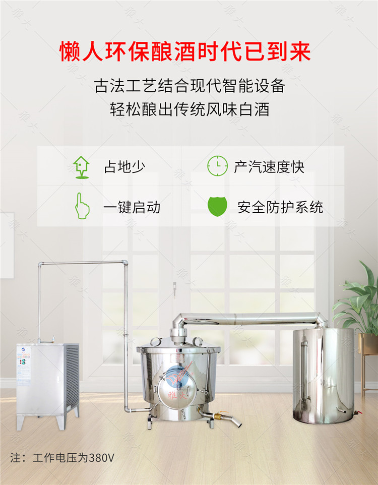 雅大新型第九代升級(jí)版電加熱釀酒設(shè)備全不銹鋼機(jī)身,安全、衛(wèi)生、高效、環(huán)保、占地面積小,出酒率高,酒質(zhì)好,該設(shè)備使用380V三相交流電,電源線為5線制,可滿足不同釀酒者的釀酒需求。